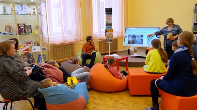 Затем своим визитом нас порадовали детский писатель Андрей Зеленин и его талантливые воспитанники из «Семейной мастерской сказок». Вместе они играли в слова, сочиняли прямо на ходу стихи и делились друг с другом невыдуманными историями.