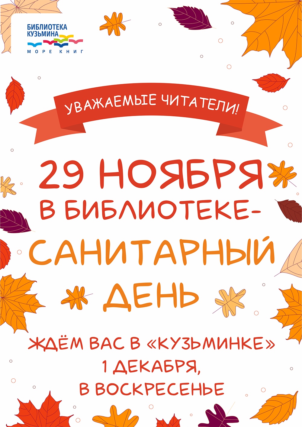Дорогие друзья, обращаем ваше внимание на то, что в пятницу, 29 ноября, у нас санитарный день, и библиотека закрыта для посетителей.