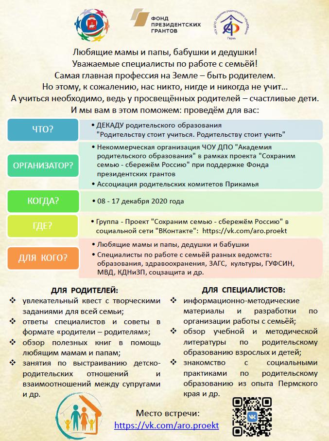 Наши партнеры «Академия родительского образования» приглашают вас принять участие в Декаде родительского образования «Родительству стоит учиться, родительству стоит учить», которая пройдет с 8 по 17 декабря в онлайн-формате.