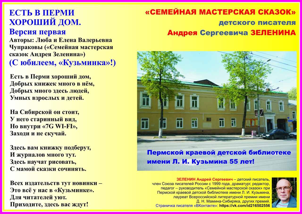 Друзья! Наша «Кузьминка» получила свое первое поздравление с наступающим юбилеем. Да не простое, а очень ритмичное и поэтичное! От дорогих и любимых читателей, участников «Семейной мастерской сказок» семьи Чупраковых. Ну и, конечно же, мастер слова – их наставник – Андрей Сергеевич внес в их рифмованные строчки частичку своего таланта, тепла и заботы. Смотрите, что из этого получилось!
